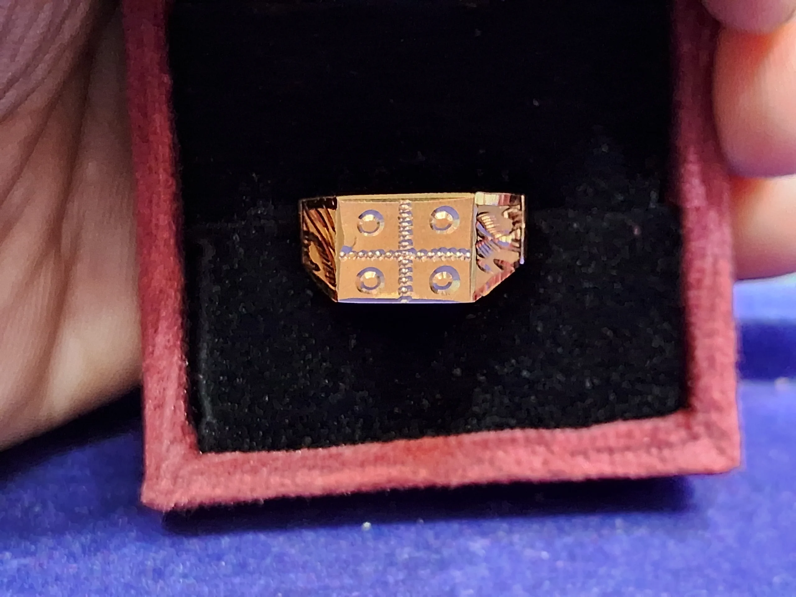 This sleek and refined gold signet ring features a distinctive cross-like pattern on its face, highlighted by delicate beadwork and circular engravings at each corner. The symmetrical design conveys a sense of balance and structure, making it a sophisticated yet bold accessory. The side engravings add an artistic touch, enhancing its overall appeal. With its minimal weight and sharp detailing, this ring is perfect for those who appreciate elegance with a modern twist.