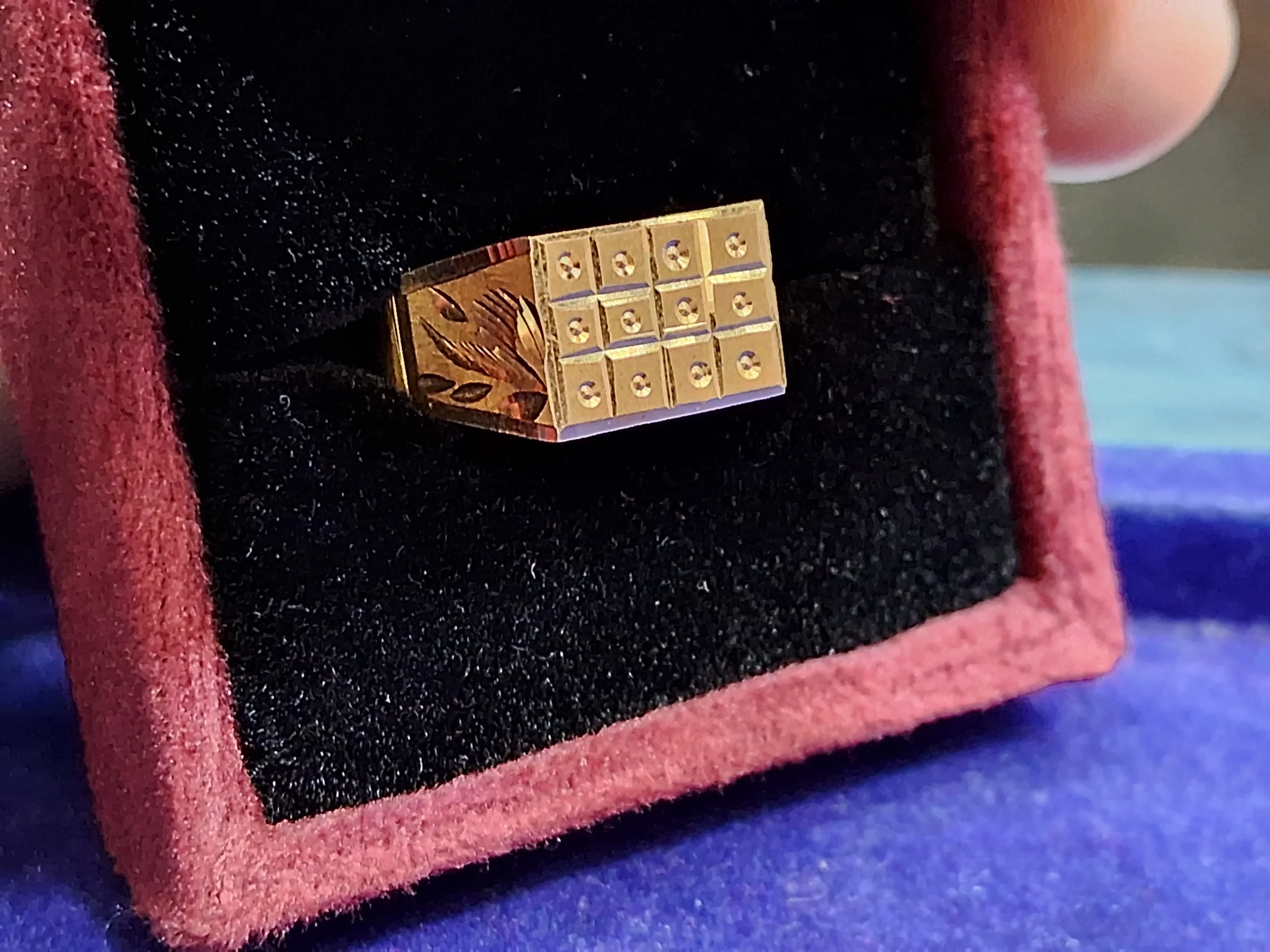 This striking gold signet ring showcases a structured grid design with small, precisely placed embellishments at each intersection, creating a sense of symmetry and refinement. The rectangular face, combined with intricate side engravings, adds a bold yet sophisticated touch, making it a standout piece. The craftsmanship highlights modern geometric elegance, making it perfect for those who appreciate structured aesthetics with a luxurious feel.