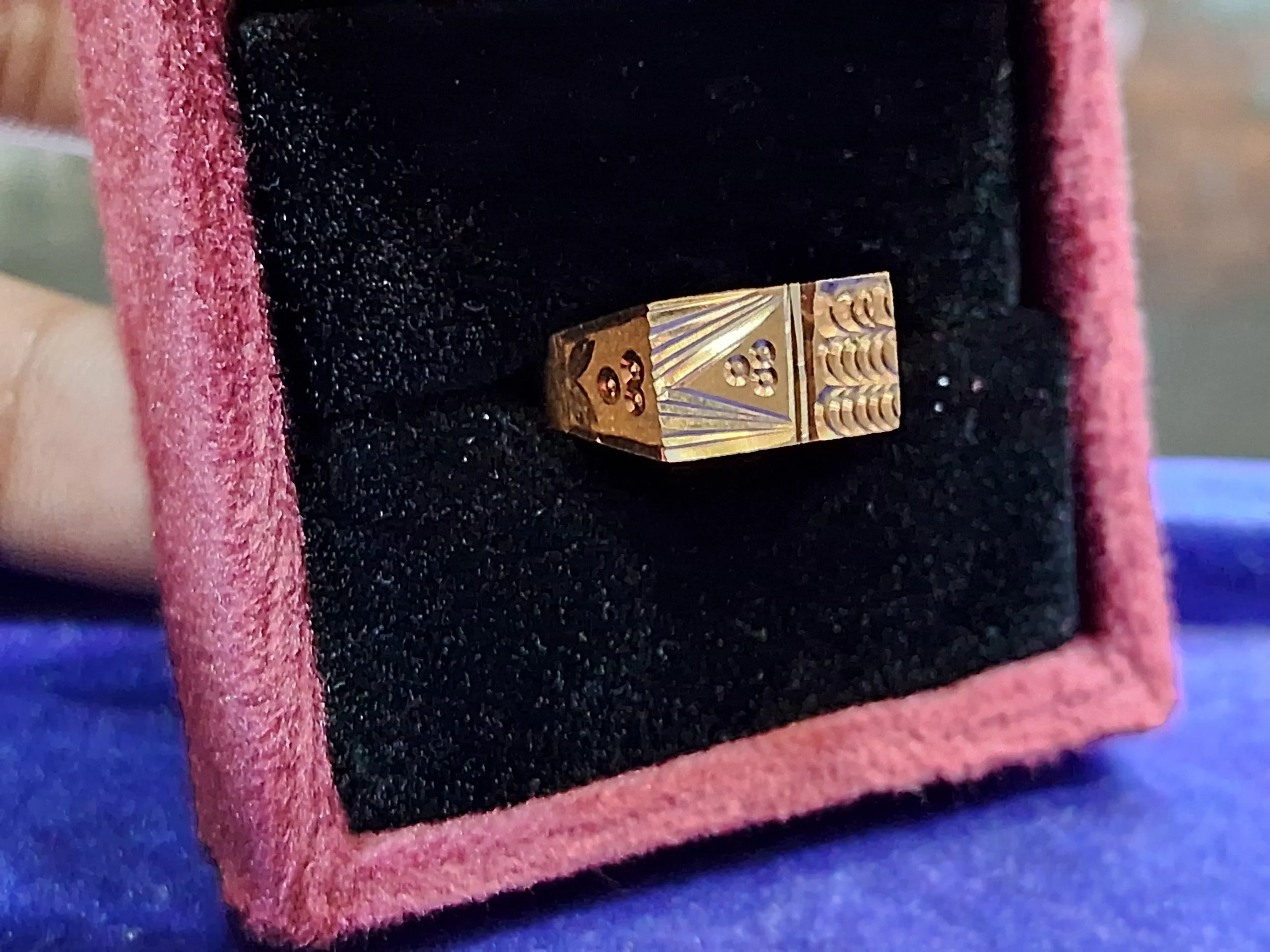 A refined gold ring with a sleek hexagonal design, accentuated by intricate engravings and delicate diamond-cut details. The polished geometric patterns and fine craftsmanship add a touch of sophistication, making this piece a perfect balance of modernity and tradition. Lightweight and stylish, it’s ideal for those who appreciate subtle yet striking jewelry.