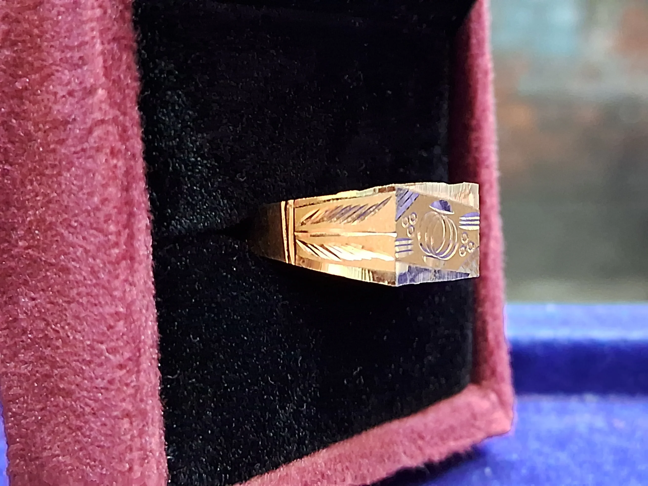 A meticulously crafted gold ring featuring intricate leaf engravings and a bold central emblem. The fine diamond-cut patterns and symmetrical detailing create a timeless look, blending nature-inspired elegance with a modern geometric touch. Lightweight and comfortable, this piece is perfect for those who seek a refined and distinctive accessory.